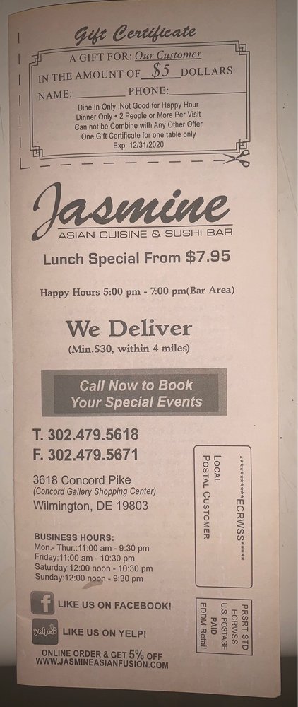 Welcome to Jasmine Asian Cuisine & Sushi Bar, an exceptional culinary destination blending the best of Japanese and Chinese flavors. Located conveniently on Concord Pike in Wilmington, DE, this trendy and classy establishment is perfect for any occasion. The menu is a delightful tapestry of tastes, offering everything from expertly crafted sushi rolls like the California Roll and spicy creations to savory stir-fries and traditional favorites like crab rangoon.